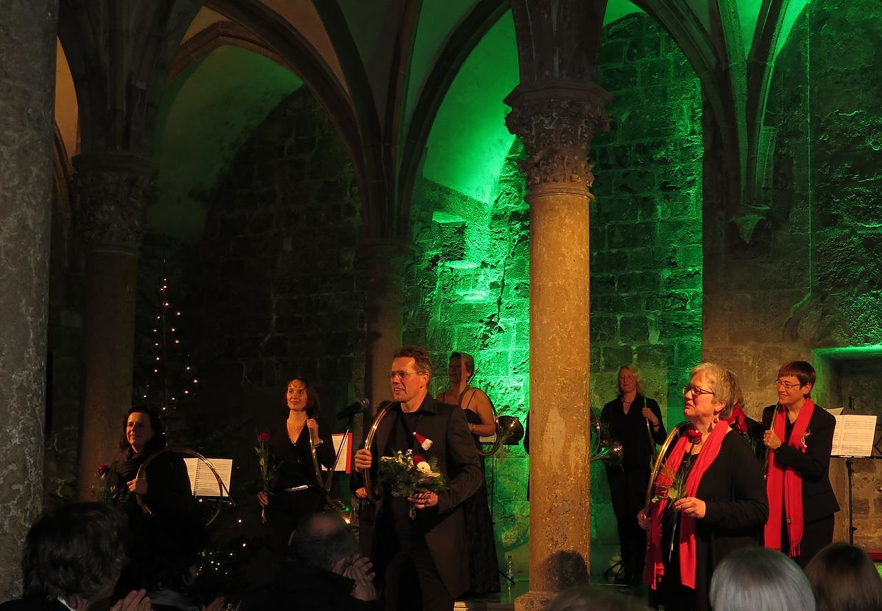 Nach einer Pause waren auch die Zuhörer im ausverkauften Kreuzgang eingeladen. Weihnachtslieder wurden gesungen, begleitet von den Jagdhörnern. Das gefiel dem Publikum so sehr, dass die Musikerinnen und der Musiker erst nach vier Zugaben und stehenden Ovationen "entlassen" wurden.