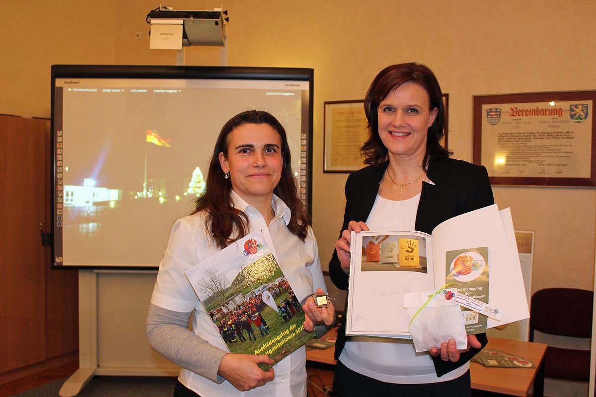 Es war an Sandra Oesterheld, die eindrucksvoll von der Preisverleihung im Bundesinnenministerium berichten durfte. Nicht ohne Grund, denn sie war auf die Idee gekommen sich mit den Projekt gemeinsamer Ausbildungstag der Rettungskräfte bei der Helfenden Hand zu bewerben. Mit gebracht hatte sie drei Fotobücher für JRK, FFW und THW mit Bildern vom prämierten Ausbildungstag und den Unterschriften von Bundesinnenminister de Maizière und Landrätin Hochwind.