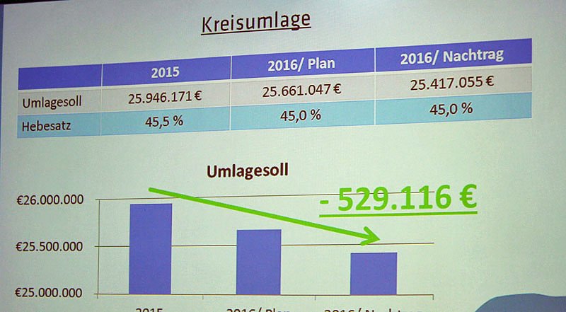 Wichtig war der Landrätin, und das betonte sie ausdrücklich, dass der Verwaltung gelungen sei, die Zusage der Kreisumlage auf 45 Prozent zu senken im Haushalt darstellbar war.