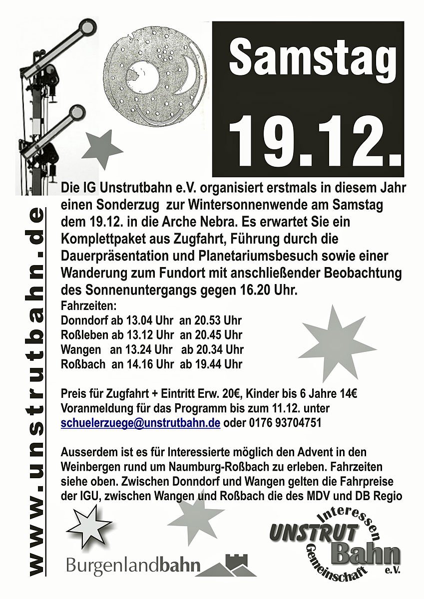 Am 19.12.2015 laden wir Sie, so die IG, zur Fahrt durch das winterlich-weihnachtliche Unstruttal ein. Mit zwei Programmpunkten möchten wir Sie ansprechen. Zum Einen lädt die Arche Nerba in Wangen zur Wintersonnenwende mit Führung am Fundort der Himmelsscheibe, der Beobachtung des Sonnenuntergangs gegen 16:20 Uhr und einem Planetariumsbesuch, sowie kleinem Imbiss ein, zum anderen findet auch dieses Jahr wieder der Advent in den Weinbergen in Roßbach statt.