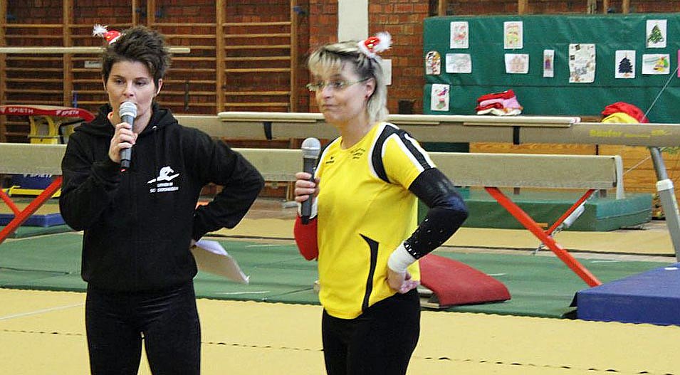 Die Begrüßung übernahmen erstmals Susanne Hofmann (die später auch moderierte) und Sabine Angelstein und konnten sich freuten, dass wieder so viele Eltern, Ureltern und sonstige Zuschauer gekommen waren. Sie informierten, dass die Eltern wieder Kaffee, Kuchen und Glühwein kaufen können und der Erlös wieder der Abteilung Turnen zu Gute kommt.