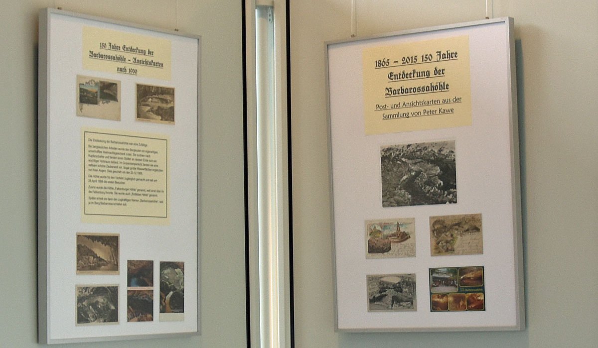 Die heutige Barbarossahöhle die einen großen Höhlenkomplex mit riesigen Seen in sich trägt. Peter Kawe zeigt mit seiner Sammlung von Post- und Ansichtskarten die sich im 2. Obergeschoss des Risalits im Regionalmuseum befindet, die Veränderungen die sich seit der Eröffnung der Barbarossahöhle als Erlebnishöhle ab dem 28. April 1866 geändert haben. So ist es der Eingang der erst ein einfaches Eisentor mit Kasse war und später dann zu einem Häuschen erweitert wurde, bis es dann Ende des 20. Jahrhunderts zu einem Massivbau so wie er heute noch gestaltet ist umgebaut wurde.