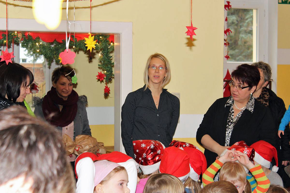 Elternsprecherin Anna-Katrin Oppermann (Bild Mitte) gratulierte im Namen aller Eltern und Ureltern, dass die Kinder in der Kita so gut betreut werden. Und auch die Eltern engagieren sich, wie beim Märchenspiel von der Goldenen Gans am letzten Freitag kn berichtete(Die Goldene Gans kommt in die Stadtkasse? ).