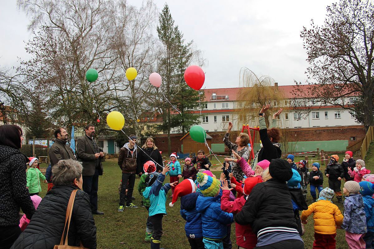 Innen wurde schon mal mit den Luftballons geübt, wie sie steigen sollen. An jedem Luftballon hing ein Zettel mit der Anschrift der Kita und der Bitte eine Nachricht zu senden, wo der Luftballon herunter kam. Jede der sechs Gruppen bekam einen Ballon für die Start.
