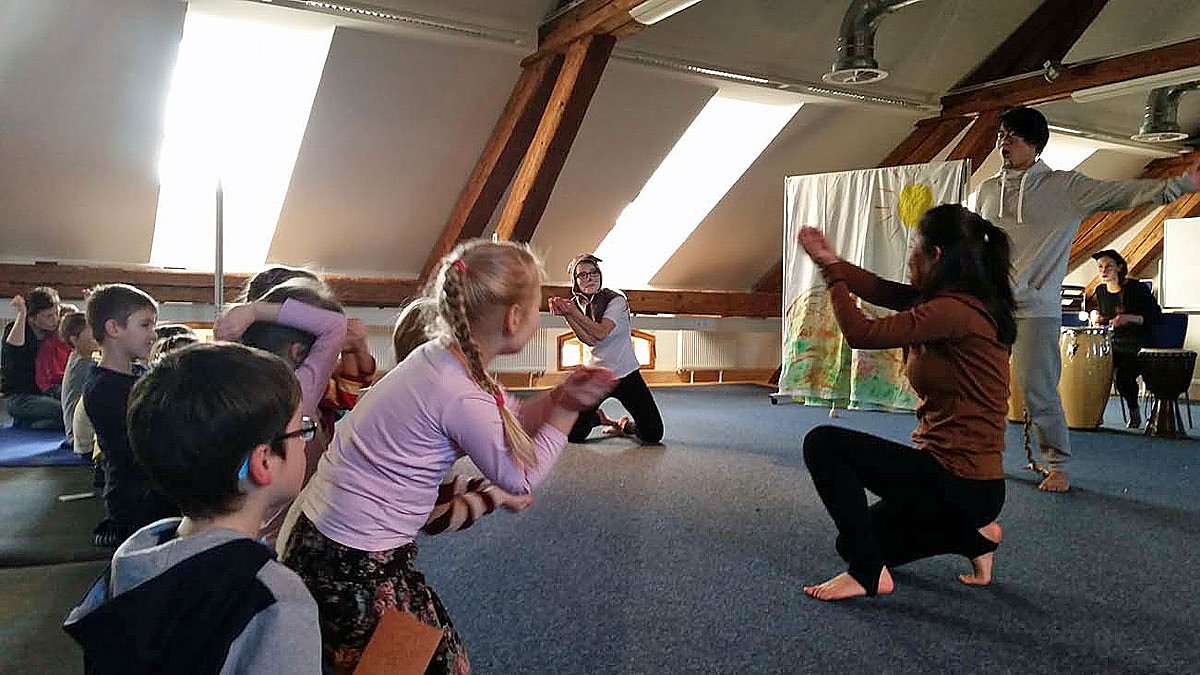Die Kinder konnten dabei nicht nur selbst Singen, sondern mit Bewegung und Instrumenten ausprobieren selbst aktiv werden. Nach einer Mittagspause entspannten die Kinder bei den beruhigenden Schwingungen der Klangschalen und einer musikalischen Geschichte der Nordhäuser Musikpädagogin Solveig Thomas. Höhepunkt des Tages war schließlich ein Mitmach-Konzert von fünf Weimarer Musikstudenten, die mit einem selbst erarbeitenden Stück und in selbstkomponierten Liedern den Kindern eine fröhliche Aufführung boten, bei der alle Kinder gespannt zuhörten.