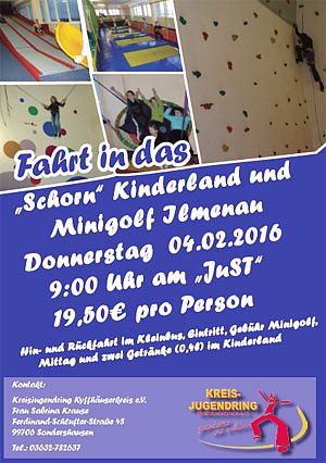 Das Kinderland Schorn bietet auf über 3000 qm Erlebnis und Spielspaß für kleine und große Kinder bei jedem Wetter. Eine Vielzahl an Animationen und Spielmöglichkeiten warten darauf entdeckt und ausprobiert zu werden. Neben einer großen Minigolfanlage laden viele Trampoline und Rutschen, ein Karussell, Kletterparcours, Bungee-Jumping, eine acht Meter hohe Kletterwand, ein großes Bällebad und Rodelbahnen zum spielen und toben ein.Anmeldungen sind noch bis zum 29.01.2016 möglich. Der Teilnahmepreis beträgt 19,50 €. Darin sind die Hin- und Rückfahrt im Kleinbus, der Eintritt ins Kinderland, die Minigolfgebühr sowie Mittagessen und zwei Getränke (0,4l) im Kinderland enthalten.