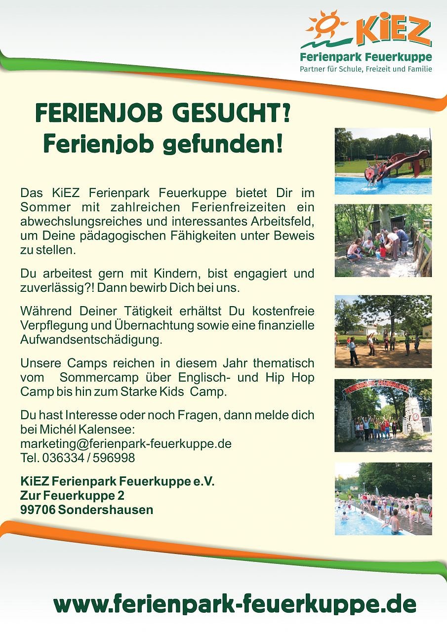 Das Kinder- und Jugenderholungszentrum (KiEZ) Ferienpark Feuerkuppe bietet jungen Menschen im Sommer ein abwechslungsreiches und interessantes Arbeitsfeld, um ihre pädagogischen Fähigkeiten unter Beweis zu stellen...