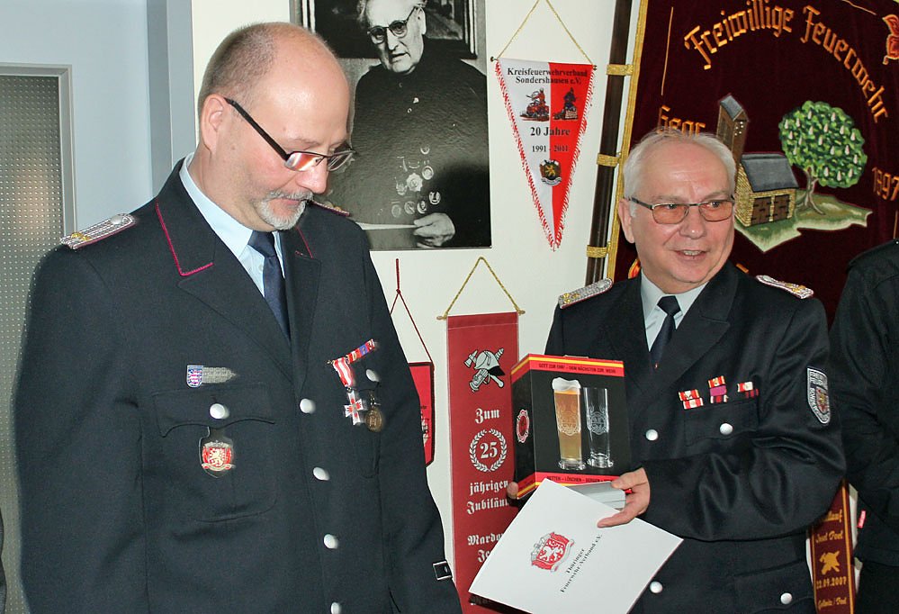 Die Wehr Jecha schloss sich mit einem Präsent an die Ehrung von Achim Sickel an. Das Präsent überreichte Wehrleiter Matthias Sickel.