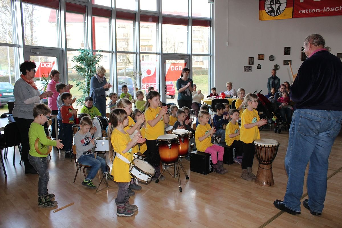 Dann wurde aber erstmal kräftig auf die Pauke gehauen, das die Wände wackelten, den man feierte bei der Freiwilligen Feuerwehr Bad Frankenhausen. Bewundernswert, wie Jürgen Müller die Gruppe dirigierte, nämlich mit einer Trillerpfeife, damit die Kinder auch merkten, wenn der Ton gewechselt werden musste.