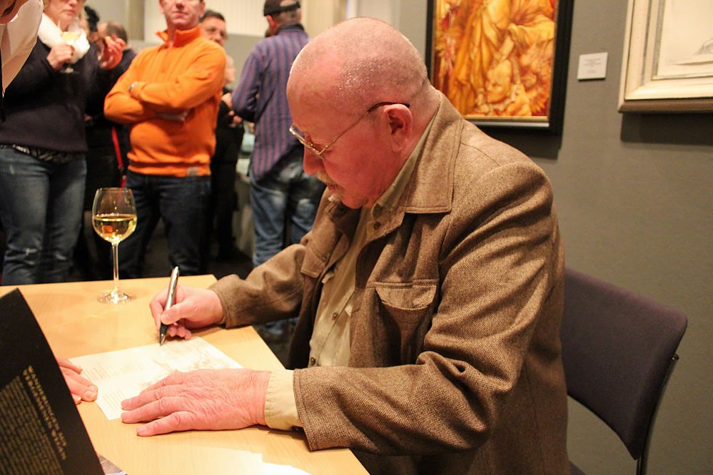 Wer wollte konnte sich hier den Ausstellungskatalog oder Poster vom Künstler signieren lassen.
