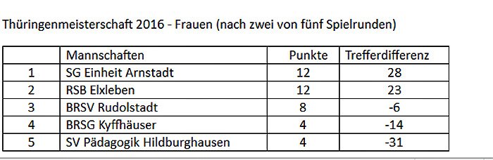 Die Frauen von Einheit Arnstadt und RSB Elxleben zeigten einmal mehr, dass sie wohl das Maß aller Dinge in Thüringen sind. Den Arnstädtern gelang dieses Mal die Revanche im direkten Vergleich, sie stehen nun an der Tabellenspitze - punktgleich mit Elxleben. Rudolstadt konnte wieder zwei Siege einfahren und belegt den dritten Platz, der die Qualifizierung für die Deutsche Meisterschaft im Herbst bedeuten würde.