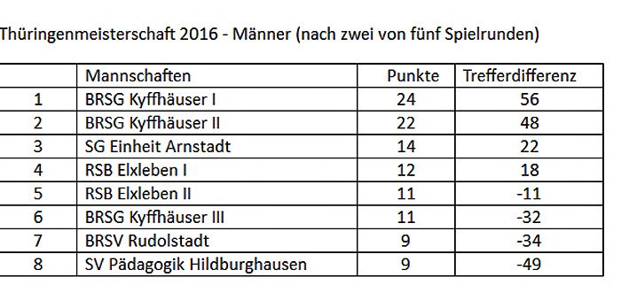 Was Arnstadt und Elxleben bei den Frauen ist, scheint die BRSG Kyffhäuser I bei den Männern zu sein. Die Sportler spielten in Bestbesetzung eine souveräne Runde und gaben nur einen Punkt durch das Unentschieden mit Einheit Arnstadt ab. Sie stehen nun mit zwei Punkten Vorsprung an der Tabellenspitze - gefolgt von der BRSG Kyffhäuser II. Auch die dritte Mannschaft spielte bisher ihre beste Saison und sammelte durch drei Siege Punkte auf dem Weg zu einem oberen Tabellenplatz.