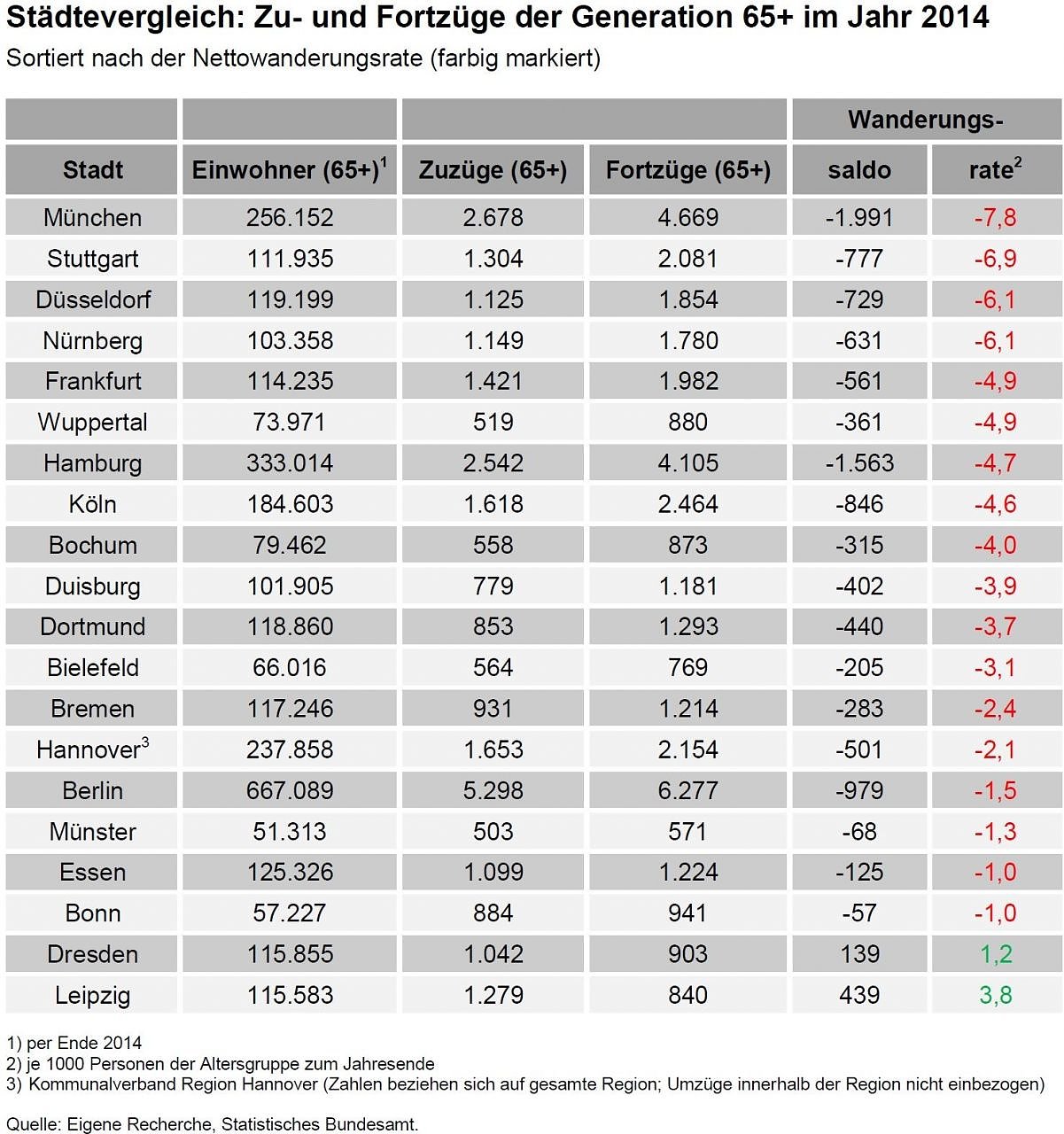 Den dritten Patz teilen sich Düsseldorf und Nürnberg mit einer Nettowanderungsrate von je minus 6,1. Von den 20 untersuchten Städten weisen einzig Dresden und Leipzig auch in der Generation 65+ einen positiven Wanderungssaldo auf – und zwar durchgehend seit 2005. Für 2014 kommt Leipzig auf 3,8 Zuwanderer pro 1.000 Einwohner dieser Altersgruppe, bei Dresden sind es 1,2.