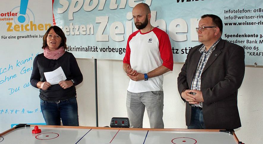 Hier präsentieren sich Patra Kubis, Heiko Raschka Geschäftsführer des Jugendhilfe- und Förderverein e.V. Bad Frankenhausen, Karina Krausholz vom Diakonieverbund Kyffhäuser, sowie Nils Schumann und Matthias Keller vor einem Airhockey-Spiel, der für das Domizil über geben wurde.
