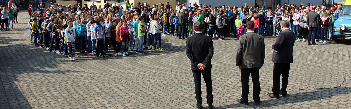 Schulleiter Hubert Töppe (am Mikrofon) machte bei der Begrüßung auf diesen historischen Fakt aufmerksam. Neben den eigenen Schülern der Regelschule waren auch die Viertklässler der benachbarten Grundschule am heutigen Schulfest mit dabei. Zur Eröffnung waren auch Volker Stietzel (Zentralamt) und Uwe Leipold (Schulverwaltungsamt) dabei, die Landrätin Antje Hochwind vertraten. Sie war zeitgleich bei einem Unternehmergespräch bei Linn High Therm in Bad Frankenhausen und wollte später vorbei schauen.