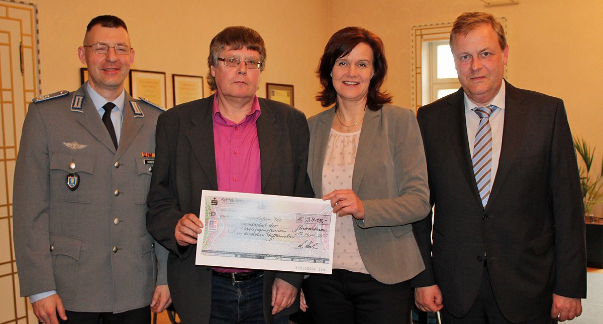 Die Übergabe der symbolischen Schecks nahmen Landrätin Antje Hochwind, das Vorstandsmitglied der Kyffhäusersparkasse Hans-Joachim Warnecke und Seitens der Bundeswehr der stellvertretende Kommandeur am Standort Oberstleutnant Holm Schreiter vor. Die gesammelte Spendensumme betrug 13.545,00 Euro und teilte sich wie folgt auf: