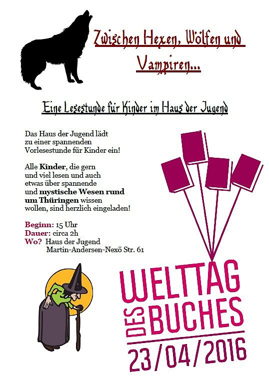 Autor: khhDas Haus der Jugend lädt am 23.04. um 15:00 Uhr alle Kinder zu einer Lesestunde ein. Thema der Lesung sind Sagen und Mythen rund um Thüringen und auch aus angrenzenden Bundesländern.