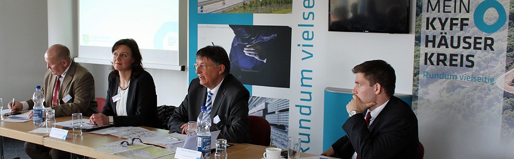 Dr. Andreas Räuber (Amtes für Wirtschaftsförderung und Kreisentwicklung), Landrätin Antje Hochwind, Staatssekretär Dr. Klaus Sühl, Thüringer Ministerium für Infrastruktur und Landwirtschaft und Dr. Cornelius Ilgmann (Abteilungsleiter für Wirtschaftspolitik, Tourismus und Digitale Gesellschaft) im Arbeitspräsidium.