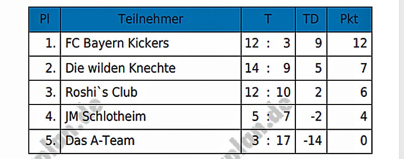 So wiurde der Spielmodus geändert und es spielte jeder gegen jeden. Sieger wurde die Sondershäuser Mannschaft von den Bayern Kickers. Den Fair Play Pokal gewann die Greußner Mannschaft vom A- Team.