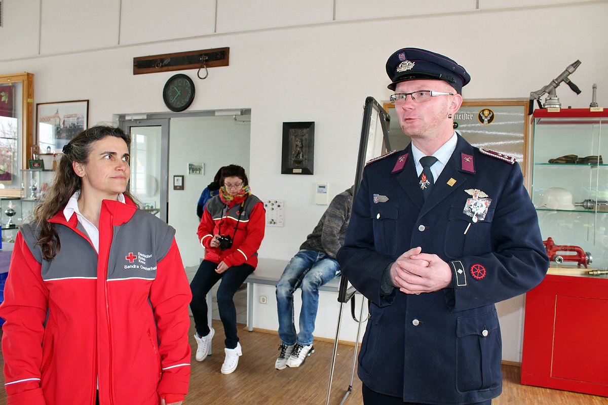 Gegen 10:30 Uhr hatten Sandra Oesterheld (Jugend DRK) und Peter Kühnert (Kreisjugendfeuerwehr) zu einer Pressekonferenz geladen. Unter den Teilnehmern Vertreter der Firma SONLUX die Leuchten für die Rettungskräfte im Gepäck hatten (dazu mehr in einem gesonderten Bericht). Weitere Gäste kamen vom THW aus Erfurt, der DRK Vorsitzende Kyffhäuserkreis Karl-Heinz Genzel. Sondershausens Stadträtin Sigrid Rößner (Die Linke) machte den ganzen Rundgang mit, zu dem später Bürgermeister Joachim Kreyer (CDU) von einer anderen Veranstaltung zustieß und auch Stadtrat Manfred Langenberger hatte kn gesichtet.