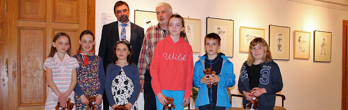 Laudator Joachim Kreyer, Fred Böhme vom Panoramamuseum Bad Frankenhausen und die jungen Künstlerinnen und Künstler vom Kinderzeichenkurs. Leider konnten acht weitere Teilnehmer heute nicht dabei sein.