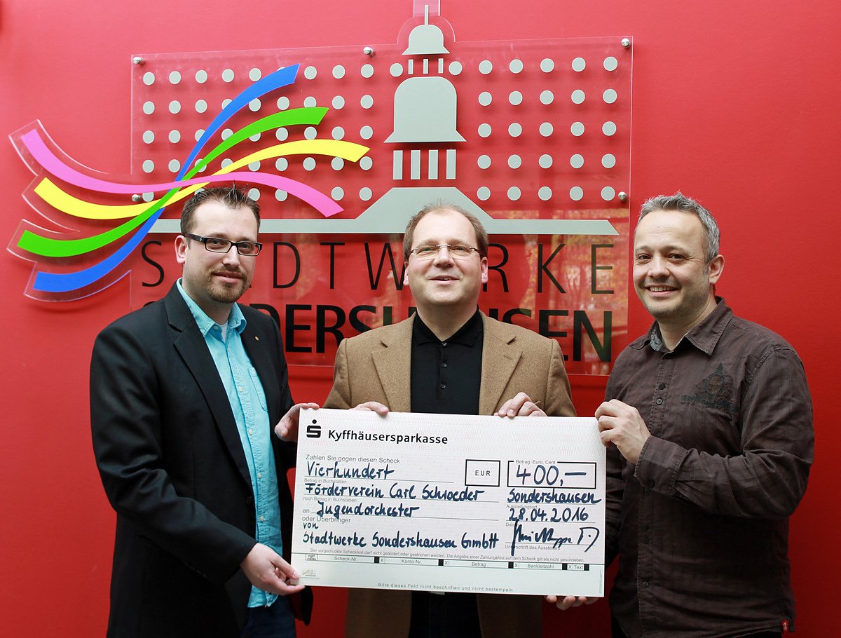 Doch jetzt drücken wir erst einmal dem Jugendorchester in Ulm die Daumen und wünschen den Teilnehmern alles Gute und viel Erfolg., so Hans-Christoph Schmidt, Geschäftsführer der Stadtwerke Sondershausen, bei der Übergabe des Spendenschecks an den Vorsitzenden des Fördervereins Martin Ludwig und dem Verantwortlichen des Jugendorchesters Matthias Deichstetter.