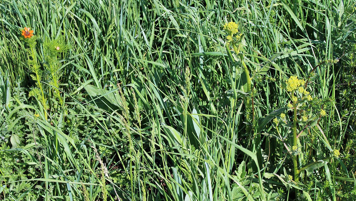Sieht fast wie Raps aus, ist es aber nicht. Die mehrjährige Pflanze (rechts im Bild), die besonders mit ihren umfangreichen Wurzelwerk die seltenen Pflanzen regelrecht unterdrückt. Hier bedrängt sie das Sommer-Adonisröschen, das bereits blüht (links im Bild).