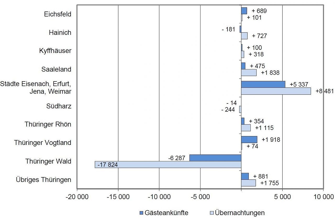 Einen Rückgang der Gäste- und Übernachtungszahlen musste in den beiden milden Wintermonaten vor allem der Thüringer Wald als größtes Reisegebiet in Kauf nehmen (Gästeankünfte: - 5,3 Prozent; Übernachtungen: - 4,6 Prozent). Diese Entwicklung beeinflusste das Gesamtergebnis für Thüringen nachhaltig und konnte auch durch den guten Start im Städtetourismus (Eisenach, Erfurt, Jena, Weimar) und in einigen anderen Thüringer Reisegebieten nicht ausgeglichen werden.