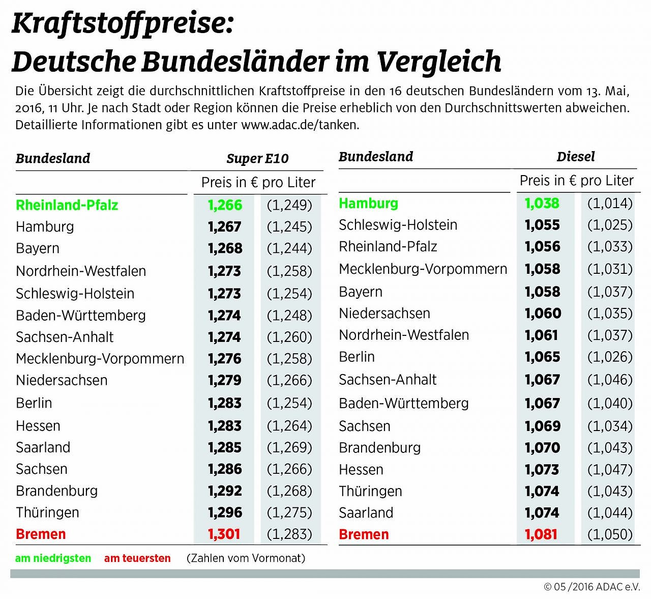 Bei Diesel beträgt die Differenz zwischen günstigstem und teuerstem Bundesland 4,3 Cent. Ein Liter kostet in Hamburg 1,038 Euro, in Bremen dagegen 1,081 Euro. Auffällig ist dabei vor allem, dass die beiden Länder Hamburg und Bremen jeweils Stadtstaaten sind und zudem lediglich gut 120 Kilometer voneinander entfernt liegen. Preiswert Diesel tanken lässt sich derzeit auch in Schleswig-Holstein und Rheinland-Pfalz, teuer ist der Kraftstoff neben Bremen auch noch im Saarland und in Thüringen.