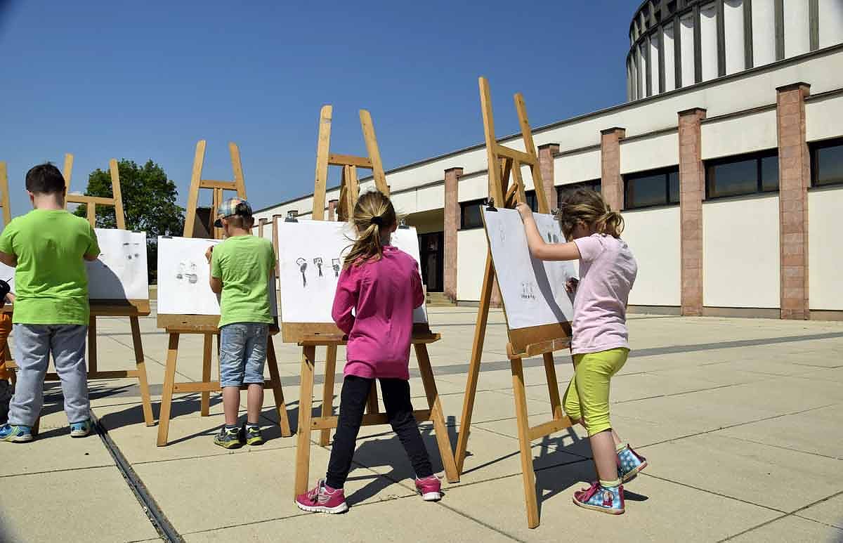 Also folgte die Frage, wovon die Kinder am Sonntagmorgen geweckt werden. Ihre Vorschläge sind dann doch sehr heiter: Vom Wecker!, ein Junge: Von meiner kleinen Schwester! Natürlich sind da noch Papa, Mama und der Verkehrslärm, als ein Mädchen ruft: Die Glocke vom Bürgermeister! Nun war es nur noch ein kleiner Schritt bis zur Kirche. Die Frage nach dem schwarzbekleideten Berufsstand, also nach den Leuten, die dort sonntags die schönen Geschichten aus der Bibel vortragen, wurde folgerichtig mit Schornsteinfeger beantwortet. Die Antworten der Kinder spiegeln eben ihre Lebensrealität. Nachdem sie dann noch etwas über den Maler Werner Tübke erfahren hatten, ging es endlich zum Panorama-Gemälde. Zusammen mit dem Museumspädagogen, der ganz viel erzählte, wanderten sie eine Runde entlang an der Balustrade und betrachteten dabei Ritter, Bauern, Narren und allerlei gruslige Fabelwesen. Danach begann der praktische Teil im Hof vor der Museumspädagogik.