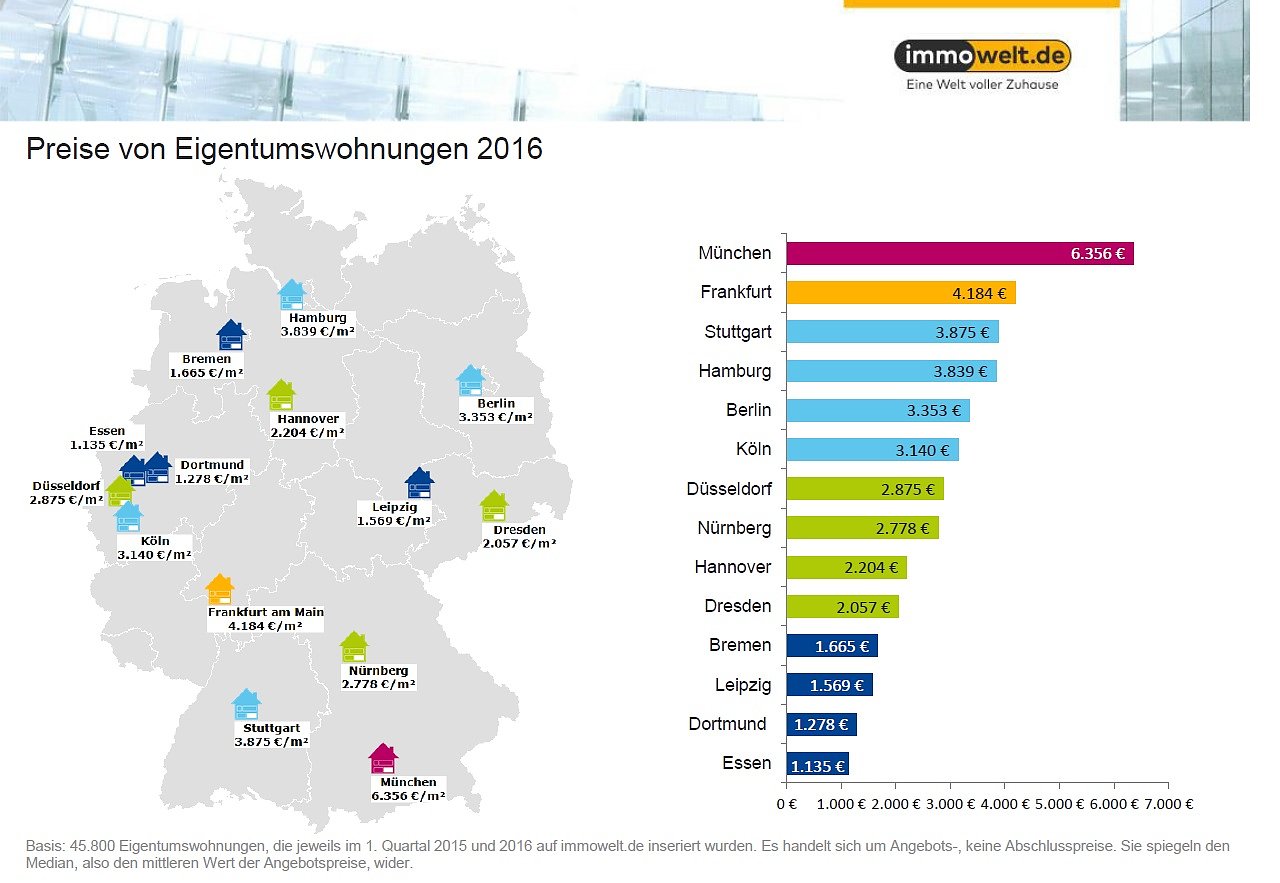 Berechnungsgrundlage: Datenbasis für die Berechnung der Kaufpreise in den 14 deutschen Großstädten waren 45.800 auf immowelt.de inserierte Angebote. Die Preise geben jeweils den Median der im 1. Quartal 2015 und 2016 angebotenen Wohnungen wieder. Der Median ist der mittlere Wert der Angebotspreise. Die Kaufpreise sind Angebots-, keine Abschlusspreise.