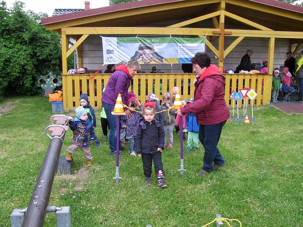 Zur Einstimmung der Veranstaltung wurde der Tag mit Verkehrsrätseln begonnen und dem Erklären von Verkehrszeichen. Den Kindern wurde das Verhalten am Fußgängerüberweg erläutert und gezeigt. Die praktische Umsetzung war ein Bestandteil des Parcours mit Spielfahrzeugen.
