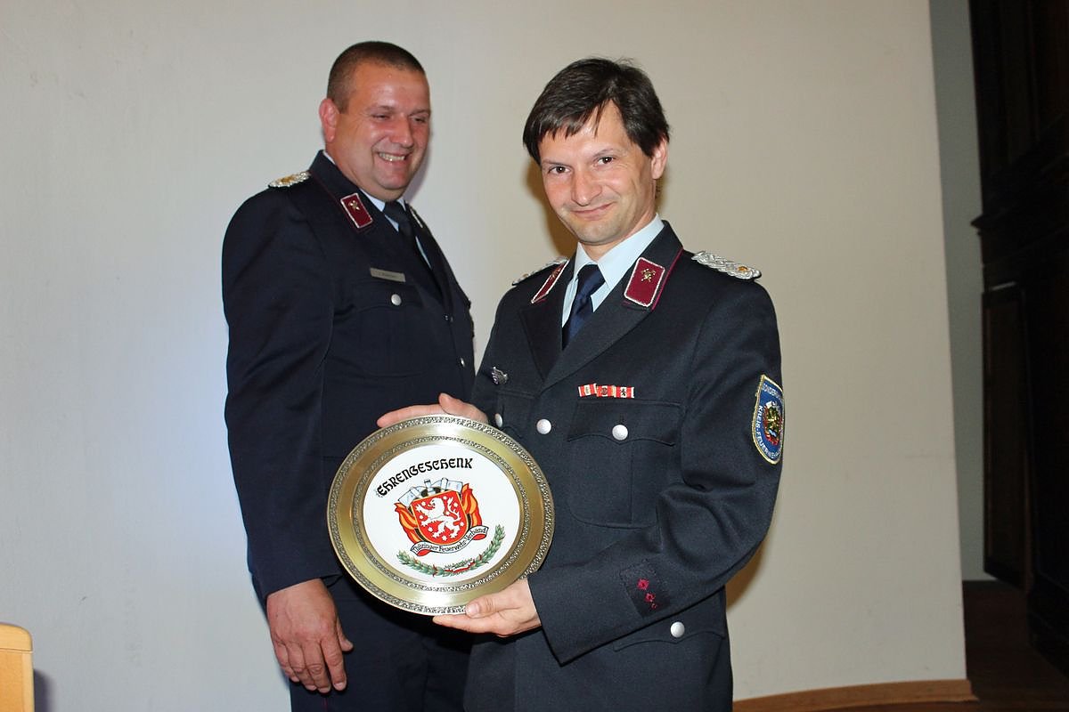 Carsten Wiedemann lobte die Jugendarbeit und die Arbeit der Alterskameraden im Verband. Er überbrachte die Grüße des Vorsitzenden des Thüringer Feuerwehrverbandes, Lars Oschmann und eine Ehrengabe für den Kreisfeuerwehrverband.