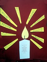 Im Anschluss an die Predigt haben Pauls Freunde, die Eltern von Paul und sein Bruder Theo und seine Patinnen eine Plakat gestaltet mit einer Kerze, auf der der Konfirmationsspruch zu lesen war und von der Lichtstrahlen ausgingen mit Segenswünschen für Paul.