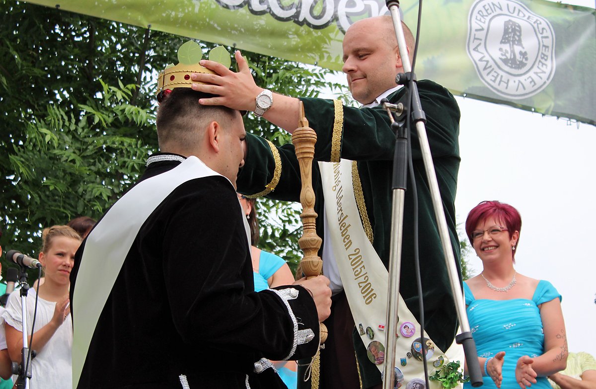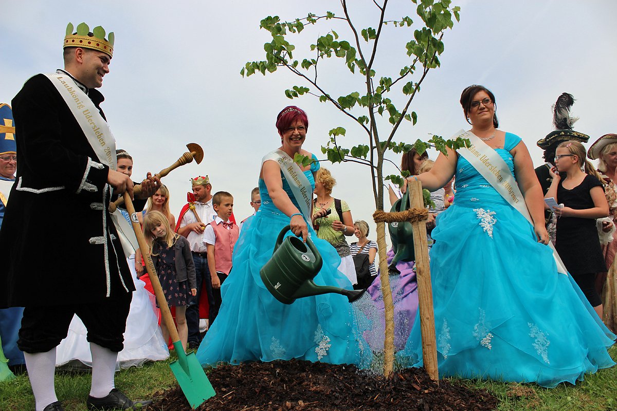 Höhepunkt des Lindenblütenfestes ist immer die Krönung des Laubkönigs, der zuvor verraten hat, wen er als Hofdamen auserwählt hat. Dieses Jahr nahm die Krönung der vorher schon verabschiedete Laubkönig Tobias I. vor, der hier dem neuen Laubkönig Frank I. die Krone aufsetzt. Das Zeremoniell wurde unter anderem von Werner Liebetrau und Birgit Schulz erstellt und seit 20 Jahren läuft das Lindenblütenfest danach ab. Zeremonienmeister ist seit Jahren Uwe Burghardt, nur sein Gehilfe wechselt.