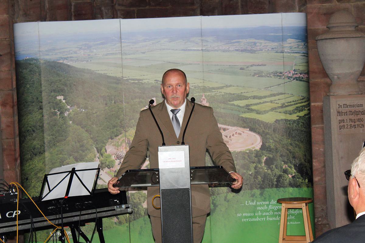 Raimund Scheja (CDU) Beigeordneter der erkrankten Landrätin des Kyffhäuserkreis überbrachte deren Grüße und verwies darauf, dass in das Gelände am Kyffhäuser 15,8 Millionen Euro bei dem jeweils höchstem Fördersatz investiert wurden. Das war notwendig, weil in 40 Jahren DDR das Denkmal stark gelitten hatte und jetzt nach der kürzlichen Sanierung im neuen Glanz erstrahlt.
