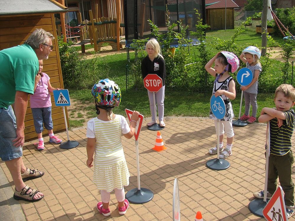Kindgerechte Aktionen werden mit Hilfe vielfältiger Aktionselemente durchgeführt. Zum Beispiel üben die Vorschulkinder im Laufrad - Roller - oder Bewegungsparcours ihre Geschicklichkeit, und lernen die Verkehrszeichen kennen.