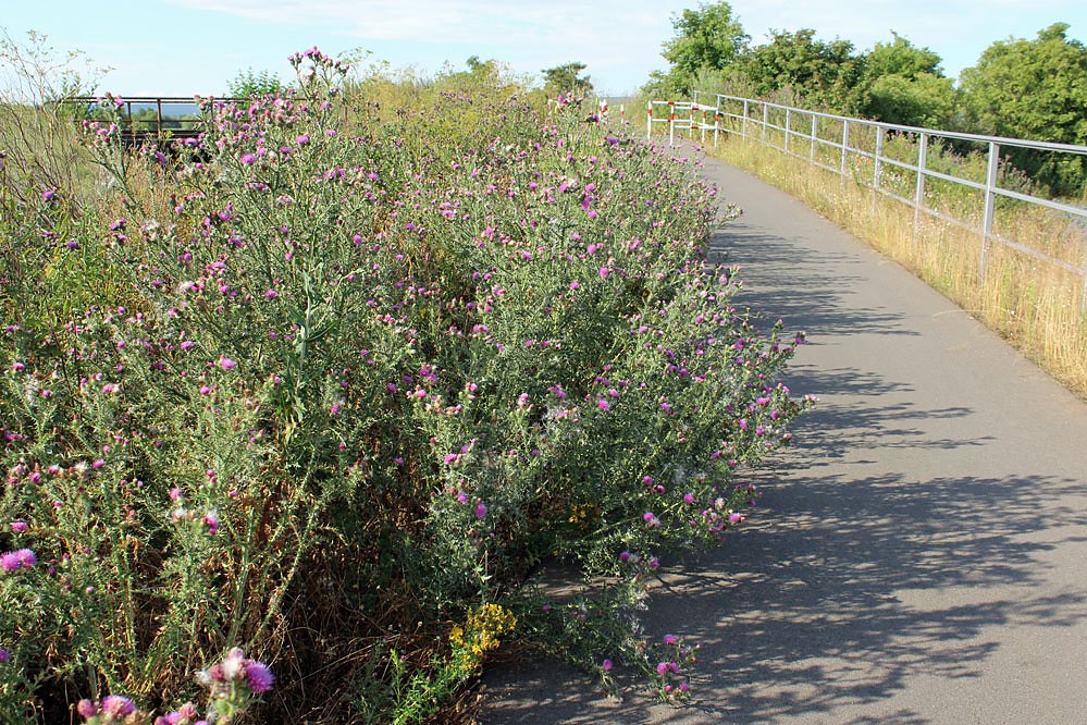 Gestern war es soweit, kn hatte sich auf die Reifen gemacht und ist auf dem UWR von Sondershausen bis Artern gefahren. Und in der Tat, an einigen Stellen wächst das Unkraut recht gewaltig, trotz Trockenheit, und behindert an einigen Stellen, wie im Bild oben zwischen Ringleben und Esperstedt oder auch zwischen Bad Frankenhausen (Gemarkungsgrenze) bis Berka (Gemarkungsgrenze) durch stark hereinragendes Unkraut (Disteln).
