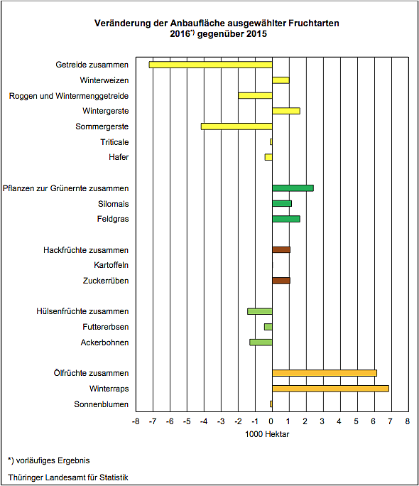 Ein Fünftel (20 Prozent) der Ackerfläche Thüringens wird für den Anbau von Ölfrüchten genutzt. Gegenüber dem Vorjahr wurden mit 120 400 Hektar fünf Prozent bzw. 6 100 Hektar mehr mit Ölfrüchten bestellt. Die Anbaufläche für Winterraps stieg von 111 800 Hektar im Jahr 2015 um 6 800 Hektar auf 118 700 Hektar im Jahr 2016.
