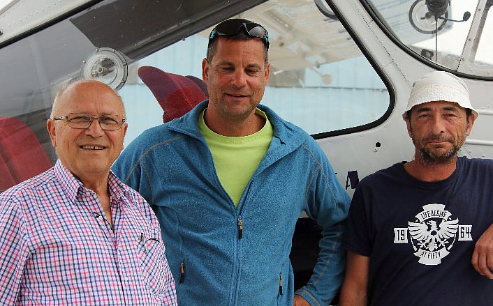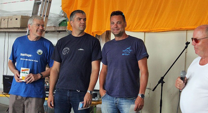Das war eine max. Entfernung von 322km und den Piloten standen mindestens 3 Stunden Zeit zur Verfügung. Die kleine Clubklasse, die fast ausschließlich mit dem Doppelsitzer Puchacz unterwegs ist, war am ersten Tag nach Aschersleben, dann nach Köthen und von da aus wieder zurück nach Bad Frankenhausen unterwegs. Sie hatten für die maximal 202 km eine Zeit von 2 Stunden. Natürlich wurden diese Strecken ohne Zwischenstopp geflogen und die genannte Zeit durfte nicht unterschritten werden. Tagessieger wurden in der kleinen Clubklasse Götz Witkop, bei den Langohren Wettermann Michael Krannich und in der großen Clubklasse Frank Krämer vom Aeroclub Hans Grade (siehe Foto v.l.n.r.).