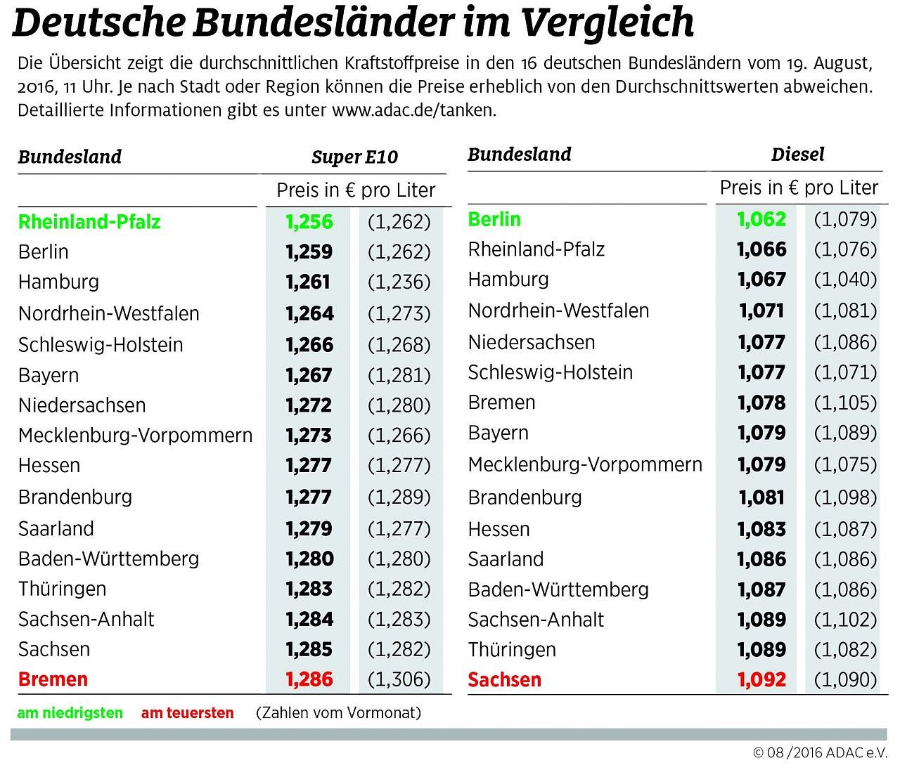 Autofahrer in Berlin und Rheinland-Pfalz kommen im bundesweiten Vergleich beim Tanken am günstigsten weg. Das hat eine ADAC-Auswertung der aktuellen Kraftstoffpreise ergeben. Danach kostet der Liter Super E10 in Rheinland-Pfalz durchschnittlich 1,256 Euro, in Berlin 1,259 Euro. Ein Liter Diesel ist in Berlin für 1,062 Euro, in Rheinland-Pfalz für 1,066 Euro zu haben...