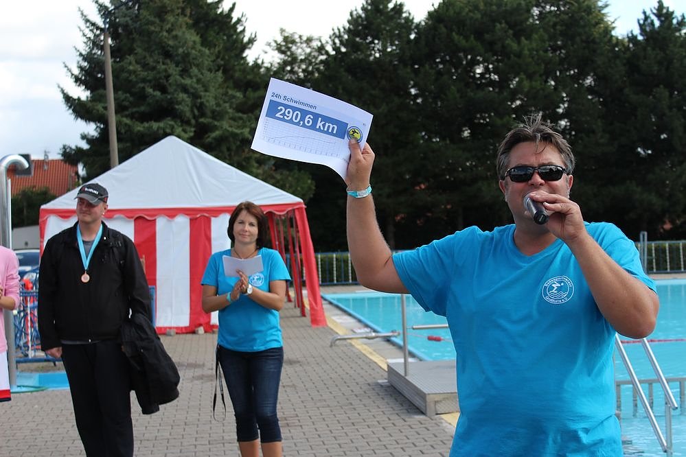 Trotzdem war Markus Töppe vom Badesportverein Großfurra sehr zufrieden beim Verkünden es Gesamtergebnisses, Ergebnisse vom Vorjahr in Klammern. Insgesamt 5.812 Bahnen a 50m (6.224 Bahnen) wurden geschwommen und dabei waren die Schwimmerinnen und Schwimmer 210 Stunden (236 Stunden) im Wasser (alle zusammen). Insgesamt 86 Teilnehmer (117 Teilnehmer) sind in die Wertung gekommen.