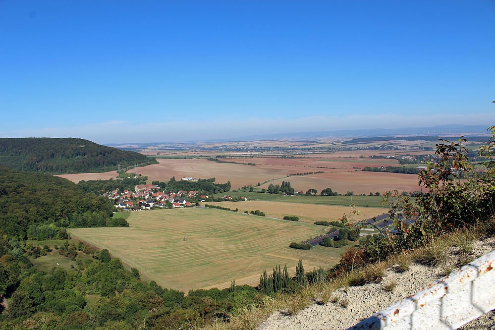 Warum heißt es eigentlich Feuerkuppe? Weil an von der Lagerfeuerstelle einen schönen Blick auf die Region hat, wie hier der Blick auf Wernrode.
