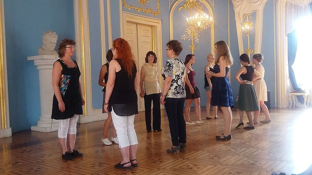 Im Blauen Saal waren die Temperaturen für mich erträglich, ich brauchte ja auch nicht zu tanzen. Das einige Besucher der freundlichen Einladung von Frau Kutscha zum mitmachen bei der Probe folgten, ist lobenswert.