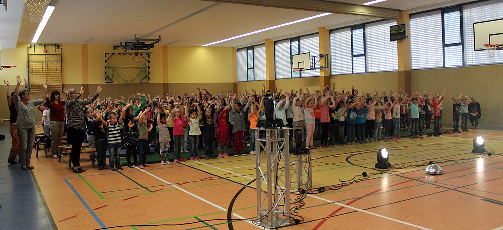 Denn die rund 250 Schülerinnen und Schlüer der ersten bis vierten Klasse der Grundschule Östertal und der Grundschule Westerengel (zwei Klasssen) schienen recht müde zu sein, meinte zumindest Clown Hajo. Und so wurde zur Aufwärmung erst mal das Lied mit Theo, Theo zum Muntermachen und Mitmachen gespielt. Das begeisterte so, dass selbst die Erzieherinnen mitmachten. So nochmals richtig in Fahrt gebracht, konnte man sich spielerisch dem Hauptthema widmen.