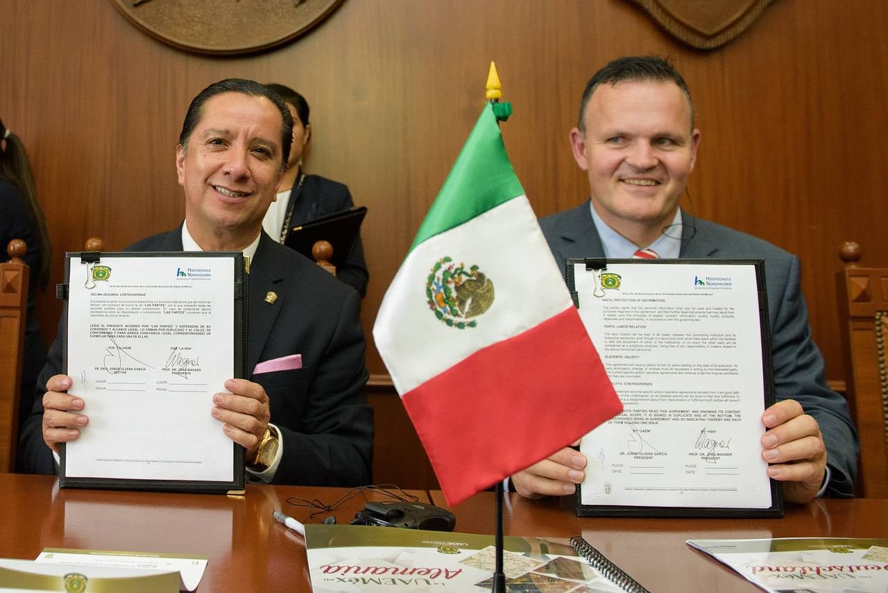 Unterzeichnung des Kooperationsvertrags zwischen der Universidad Autónoma del Estado de México und der Hochschule Nordhausen. Links: Dr. Jorge Olvera García, Rektor der Universität, rechts Prof. Dr. Jörg Wagner, Rektor der Hochschule Nordhausen.