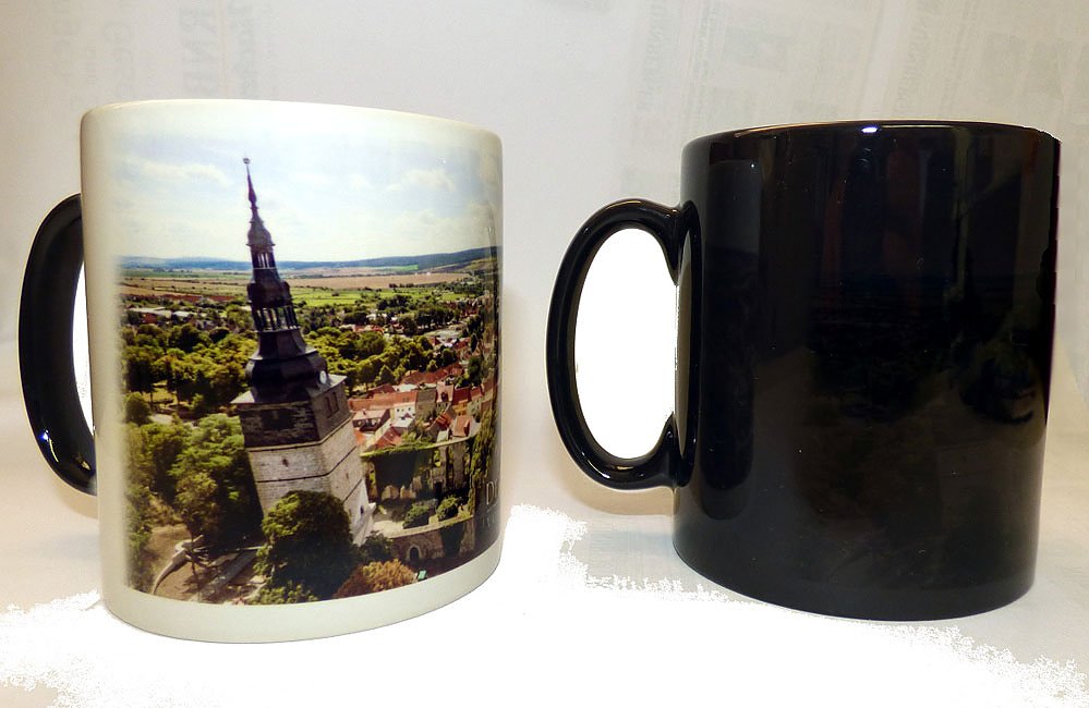 Eine Zaubertasse mit einem neuen Motiv des Schiefen Turmes von Bad Frankenhausen ist ab sofort im Informationspavillon an der Oberkirche und in der Tourist-Information für 12,00 Euro erhältlich.