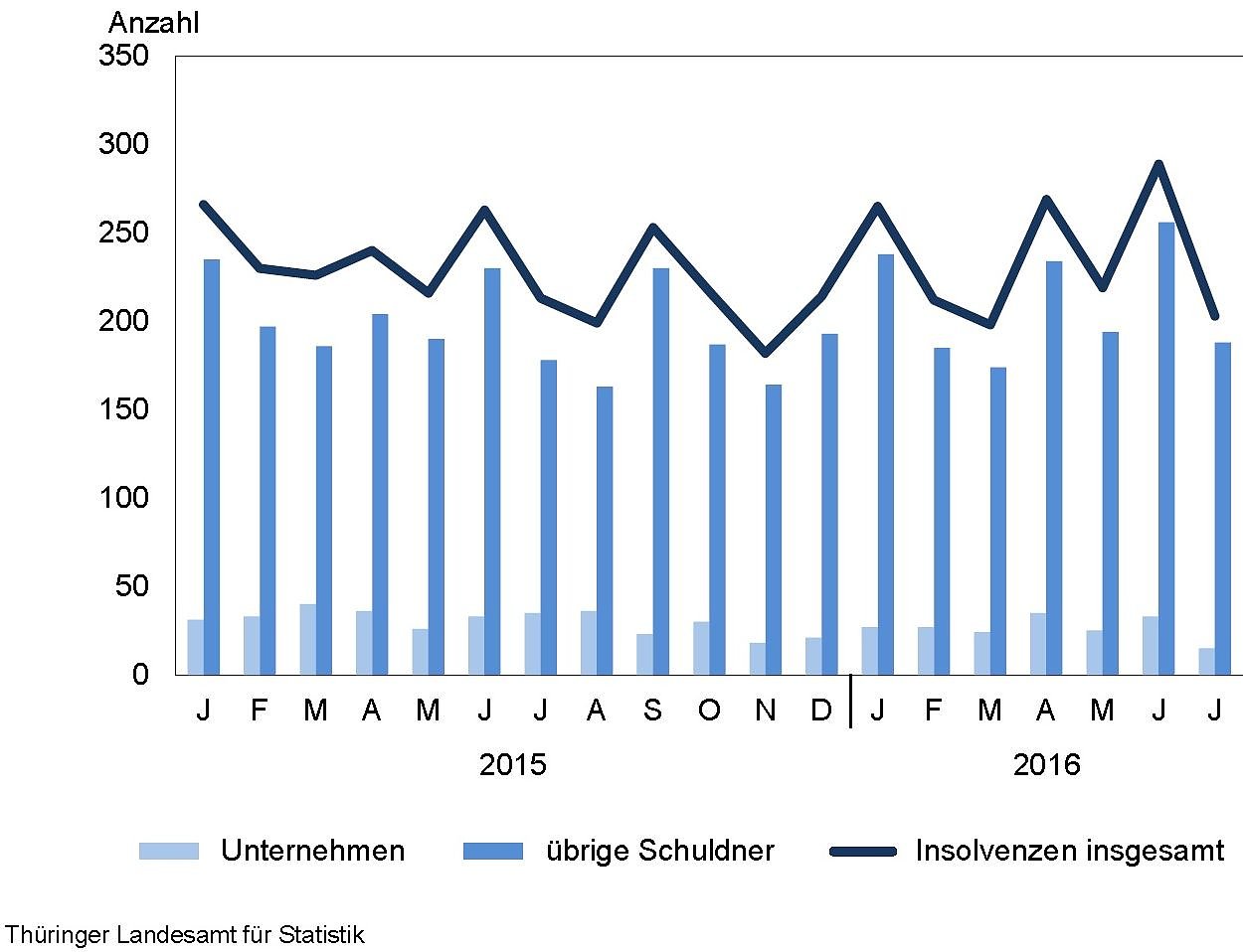 Die Thüringer Amtsgerichte entschieden von Januar bis Juli 2016 über 1 655 Insolvenzverfahren. Davon entfielen 11,2 Prozent auf Unternehmen und 88,8 Prozent auf übrige Schuldner. Nach Mitteilung des Thüringer Landesamtes für Statistik stieg die Gesamtzahl der Insolvenzverfahren im Vergleich mit dem Vorjahreszeitraum um einen Antrag...