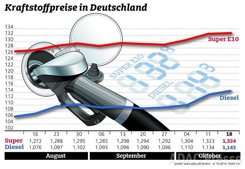 Wie die aktuelle ADAC-Auswertung der Kraftstoffpreise in Deutschland zeigt, stieg der Preis für einen Liter Super E10 seit vergangener Woche um 0,1 Cent und liegt derzeit im bundesweiten Schnitt bei 1,324 Euro. Etwas deutlicher fällt der Preisanstieg bei Diesel aus: Ein Liter kostet im Mittel 1,143 Euro, das sind 0,9 Cent mehr als in der Vorwoche.