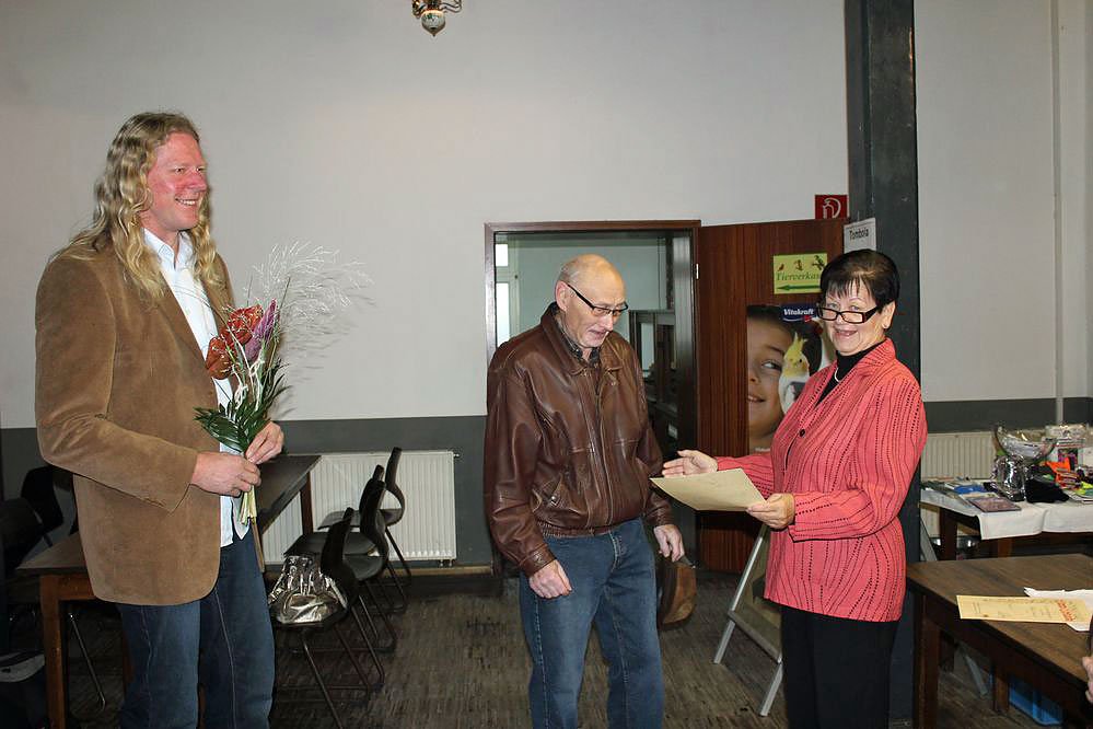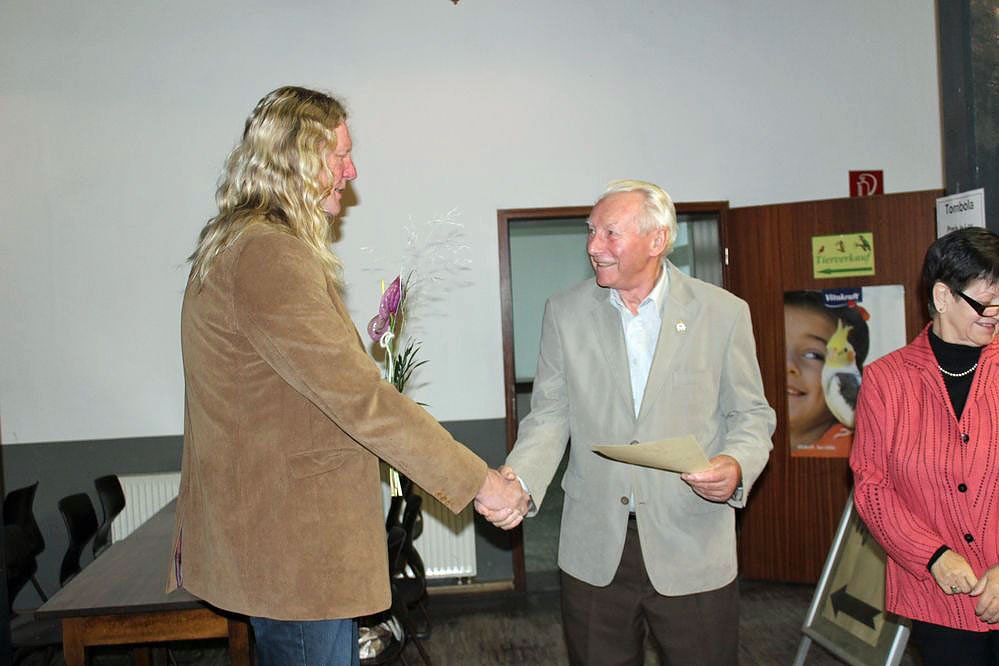 Anliegen der Ausstellung ist neben der Präsentation unserer Vögel auch das Anliegen wieder mehr Menschen unser schönes Hobby nahezubringen und sie für die Vogelzucht zu begeistern, so Vereinsvorsitzender Achim Sickel (li.) bei der Eröffnung. Natürlich wären wir auch über neue junge Mitglieder sehr erfreut, so Sickel beim Rundgang mit kn. Das Durchschnittsalter unserer Mitglieder liegt bei 63 Jahren.